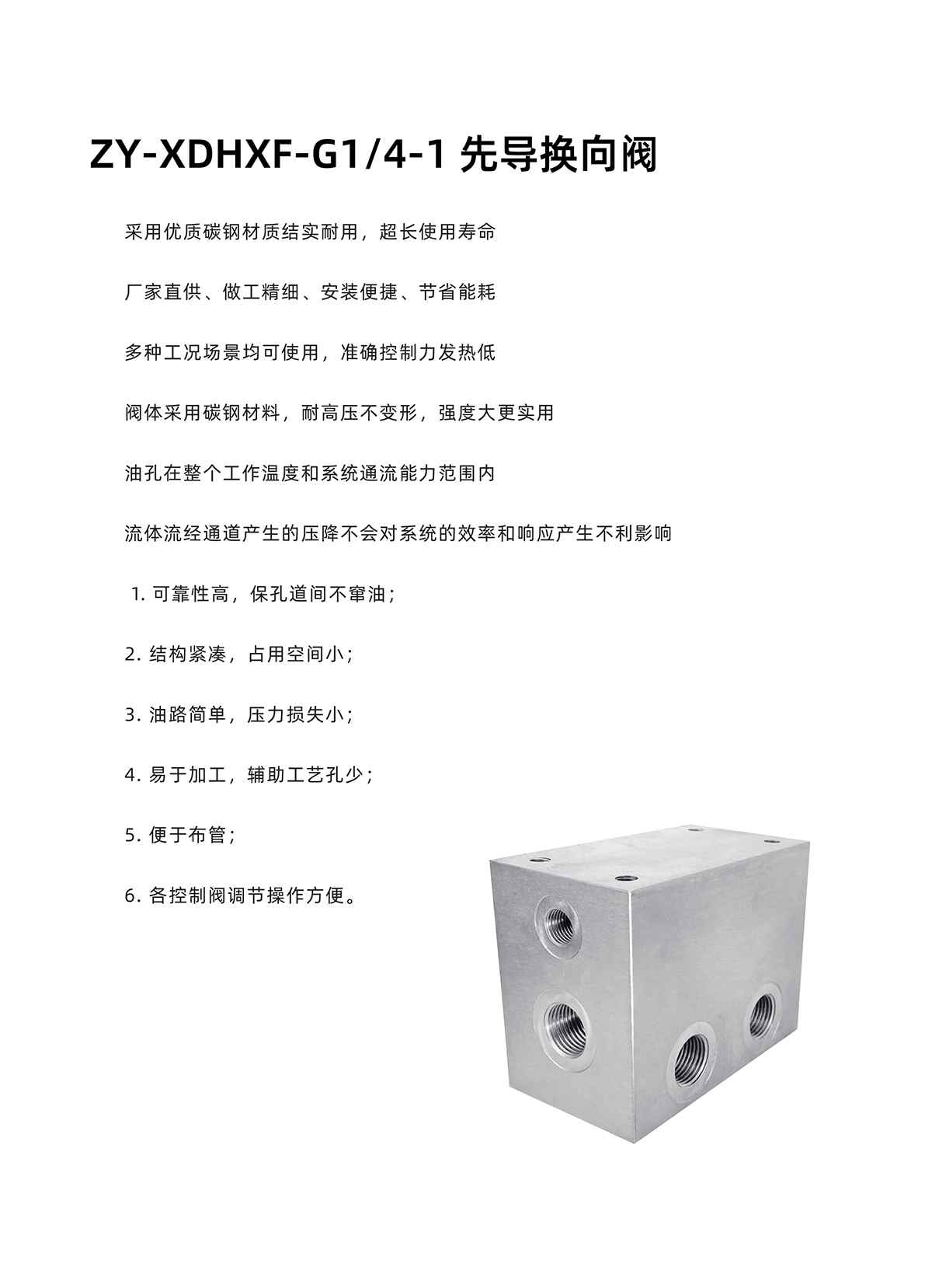 采用优质碳钢材质结实耐用,超长使用寿命 厂家直供、做工精细、安装便捷、节省能耗 多种工况场景均可使用,准确控制力发热低 阀体采用碳钢材料,耐高压不变形,强度大更实用 油孔在整个工作温度和系统通流能力范围内 流体流经通道产生的压降不会对系统的效率和响应产生不利影响 可靠性高,保孔道间不窜油;2. 结构紧凑,占用空间小;3. 油路简单,压力损失小;4. 易于加工,辅助工艺孔少;5. 便于布管;6. 各控制阀调节操作方便。
